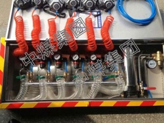 矿用压风自救装置具有减压、流量调节、消音、泄水、防尘等功能。结构轻巧、使用方便、快捷,当煤矿井下瓦斯超标时,通过该装置向工作人员提供新鲜空气,达到安全避灾的作用。