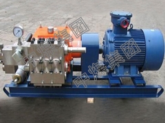 本系列喷雾灭尘泵为卧式三柱塞往复泵,由卧式四极防爆电动机驱动,经联轴器和一级斜齿圆柱齿轮减速后带动曲轴旋转,再经过连杆滑块机构使曲轴的旋转运动转变为柱塞的直线往复运动。曲轴以两端主轴颈为支承点,安装在箱体内。为便于安装,两端轴承均有轴承套定位及压紧。曲轴各曲拐处与连杆大头薄壁瓦配合。连杆大头为剖分式结构,瓦盖用连杆螺栓与连杆体对合联接,铁丝保险。连杆小头制成球形,通过球座和球面对开挡块与滑块连接。滑块前端T形槽结构悬挂柱塞,便于柱塞的拆装。曲轴外伸端装有大齿轮,呈悬臂结构。小齿轮轴一端支承在箱体上,另一端支承在齿轮箱上,齿轮箱以箱体端面及齿轮轴轴承的外圆定位,保证齿轮轴两支承孔的同轴度要求。